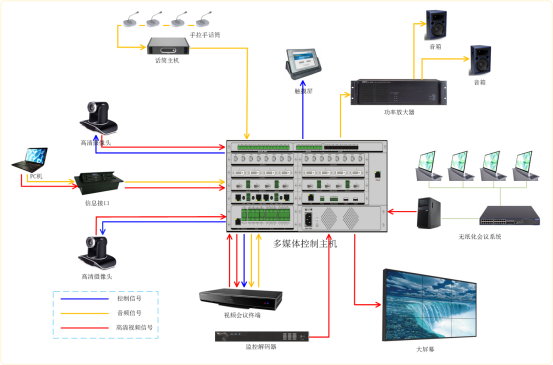 2、 多媒体控制系统:采用ng28(南宫)科技生产的多媒体会议室核心设备----多媒体控制主机,集高清混合矩阵、数字音频处理器、集中控制主机、高清录播服务器于一体。