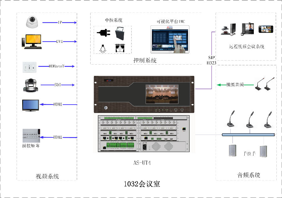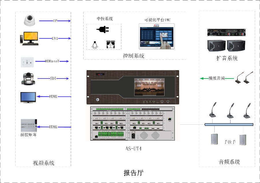 中控、音频、视频一体化可视化应用,部署方便、使用灵活、维护简单。