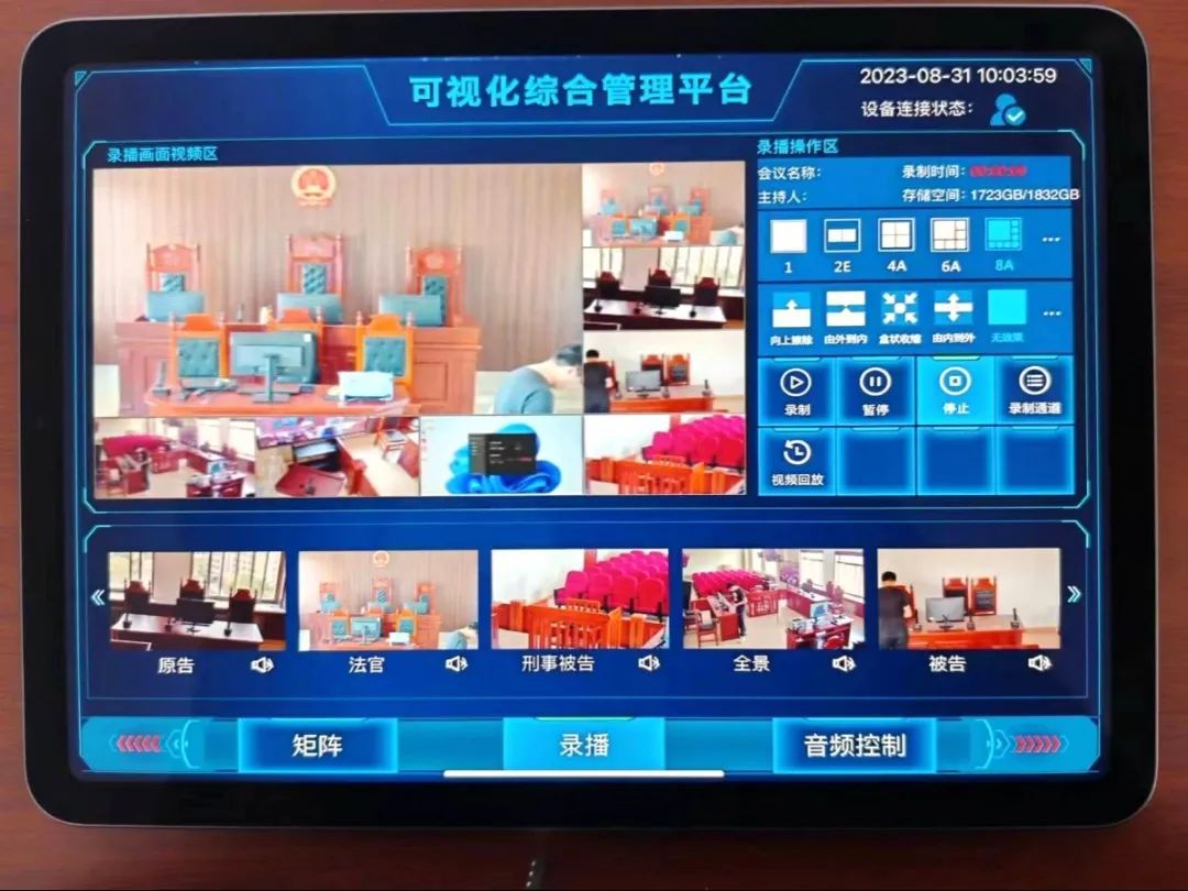 模拟法庭的核心硬件设备采用ng28(南宫)科技高清庭审主机,功能包含:庭审实况采集、示证采集、庭审音频处理、视频无缝切换、庭审集中控制、录播直播、远程提讯终端、多方远程庭审。产品采用ALL-IN-ONE的设计理念,运用热插拔模块化设计,软件可视化操作界面平台,具有安装简便,操作简单、维护容易等优点。