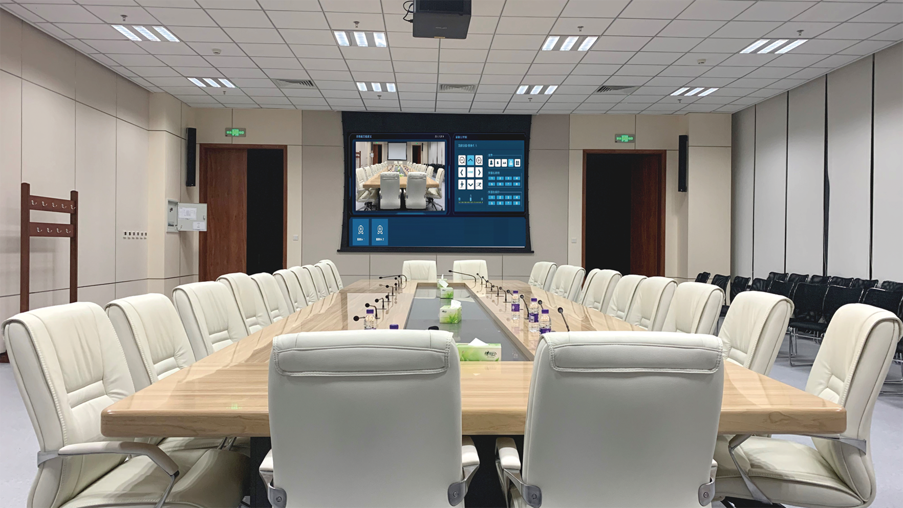 8. 临时报告厅功能:只需要移动双方当事人和证人/嫌疑人席位,一键场景切换后,在声场、视频采集显示以及中控控制等功能完全满足报告厅使用需求;